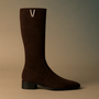 Diese kniehohen Stiefel aus edlem Veloursleder vereinen klare Linien mit luxuriöser Schlichtheit. Das schlanke, feminine Profil wird durch das weiche, tiefbraune Suede und den feinen Silberakzent am Schaftabschluss stilvoll ergänzt. Der flache Blockabsatz sorgt für Komfort im Alltag, während die präzise Verarbeitung zeitlose Raffinesse ausstrahlt.