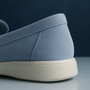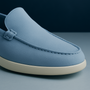 Ein Ausdruck subtiler Eleganz. Der Serein ist ein handgefertigter Loafer aus weichem, hellblauem Veloursleder – minimalistisch im Design, kompromisslos in Qualität. Die schlanke Silhouette und die makellose Verarbeitung spiegeln moderne Raffinesse wider, während die kontrastierende weisse Gummisohle für zeitgemässen Komfort sorgt.